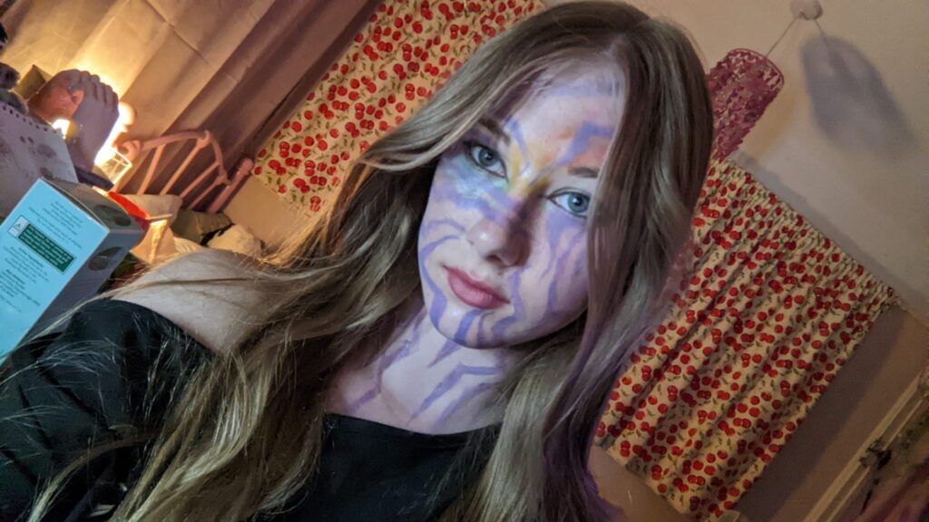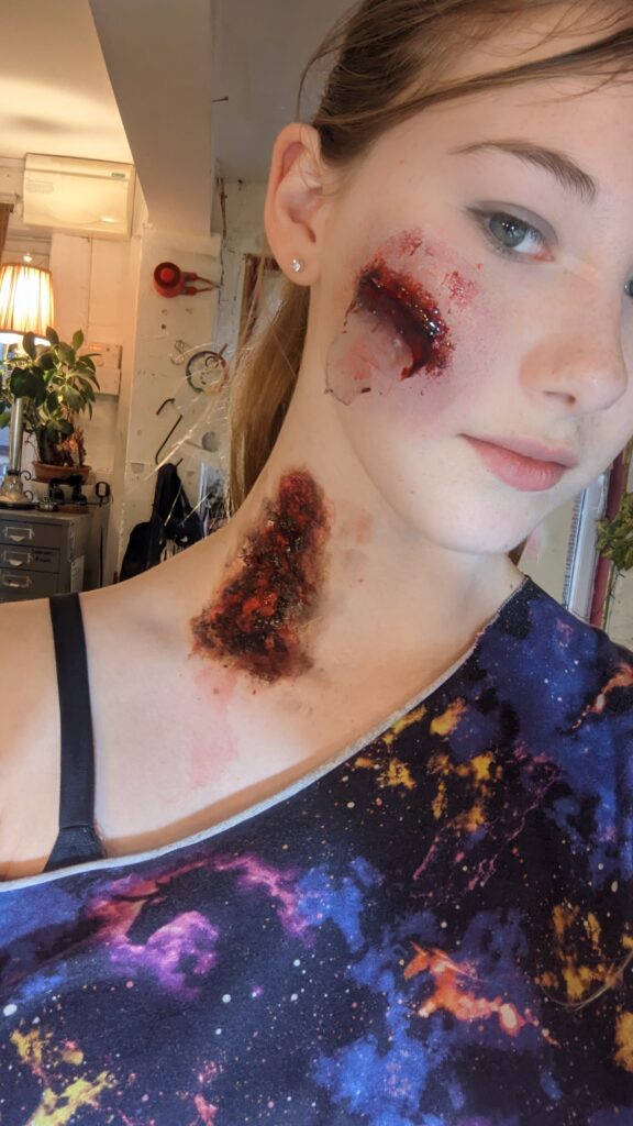 After discovering I could create fake black eyes and bruises at 10 years old, I used fake blood and online tutorials to expand my abilities. I then started to attend SFX makeup sessions and did my work experience at a local amateur dramatics group where I now regularly volunteer.